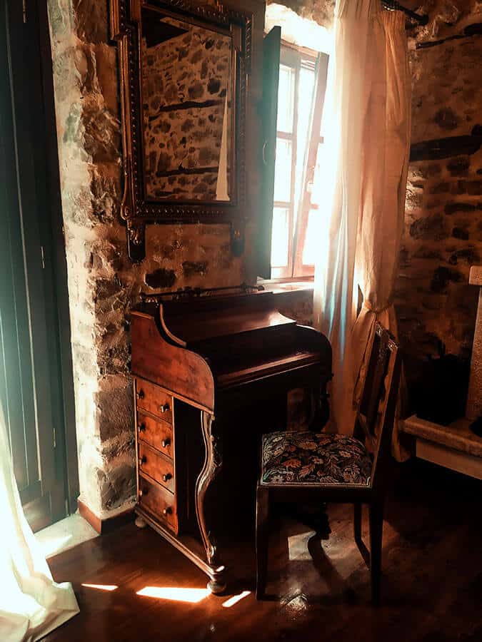 Η ξύλινη ντουλάπα με τις ανάγλυφες λεπτομέρειες , το σεκρετέρ, ο καναπές (που γίνεται κρεβάτι), το τζάκι για τις κρύες νύχτες του Χειμώνα και το ονειρεμένο κρεβάτι με τις κουρτίνες, συνθέτουν άψογα ένα χώρο που αποπνέει παράδοση, ζεστασιά, φιλοξενία και ηρεμία!