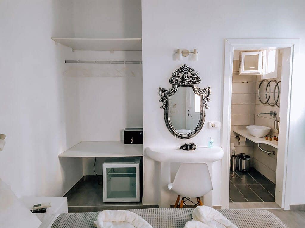 Το κρεβάτι, τα κομοδίνα και το boudoir είναι χτιστά και αποτελούν μια λεπτομέρεια που θα βρείτε και σε αρκετά νησιώτικα σπίτια. Επιπλέον, θα λατρέψετε τον vintage καθρέφτη και το χειροποίητο χαλάκι στον τοίχο!
