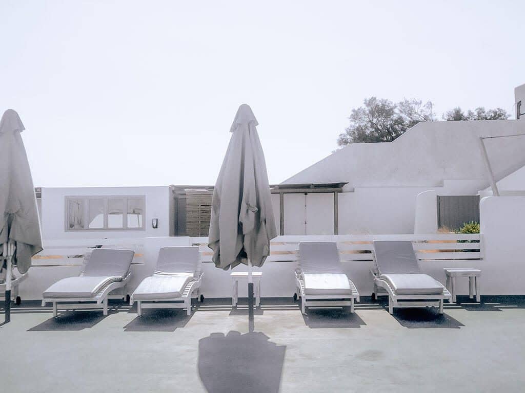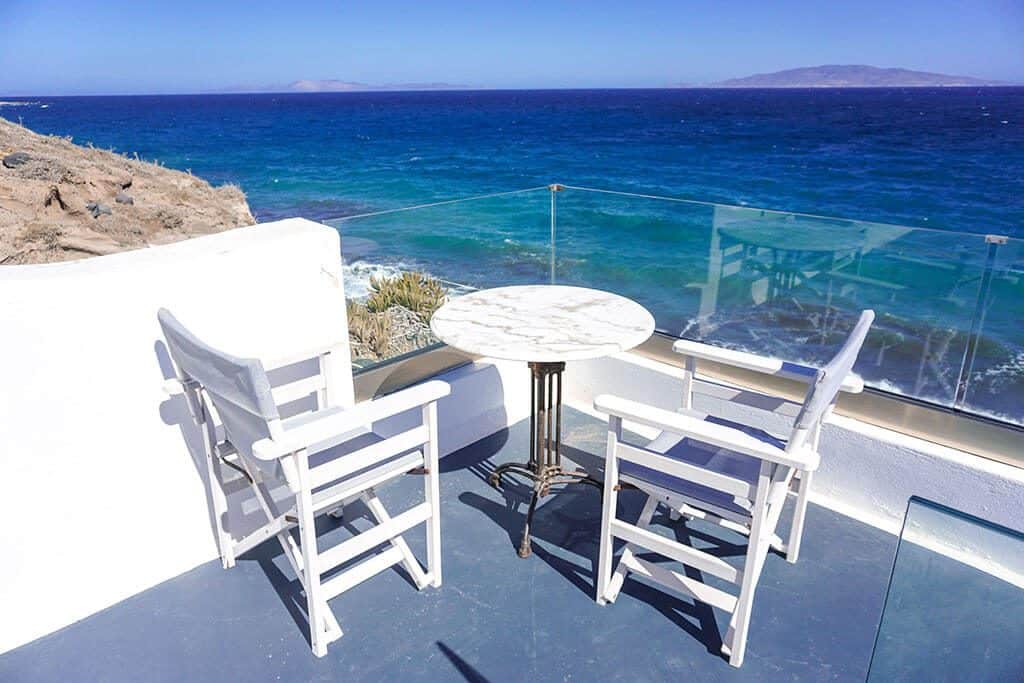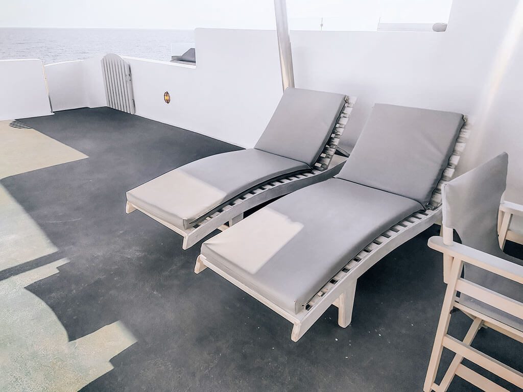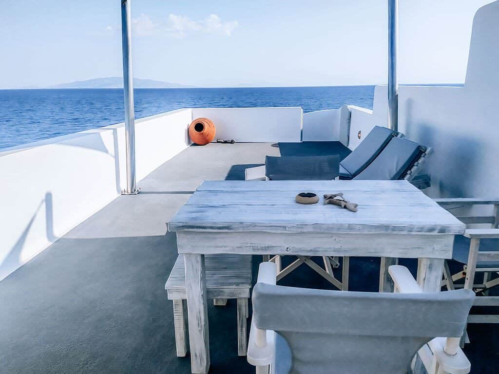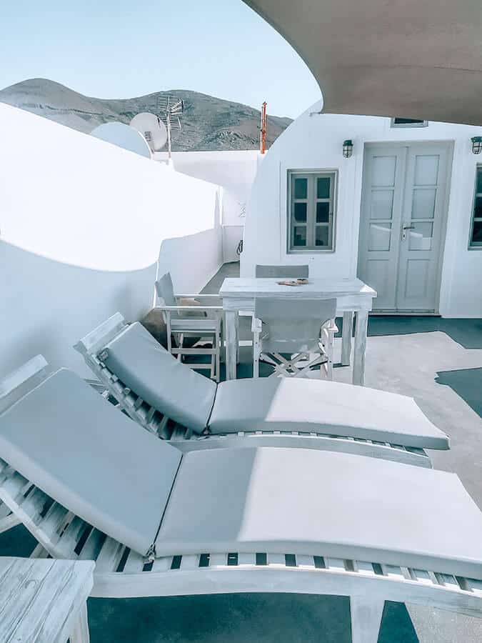 Για να οδηγηθείτε στο δωμάτιο θ’ ανεβείτε τα σκαλάκια και θα βρεθείτε σε μια μεγάλη βεράντα. Οι ξαπλώστρες, το τραπέζι ξύλινο τραπεζάκι και η διακόσμηση με το πιθάρι και τις πέτρες, θα σας κάνουν να επιθυμείτε να περάσετε εκεί όλο το καλοκαίρι.