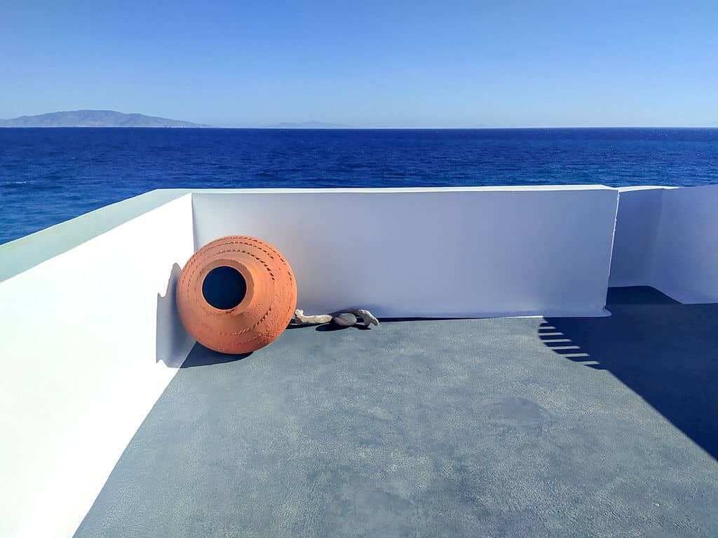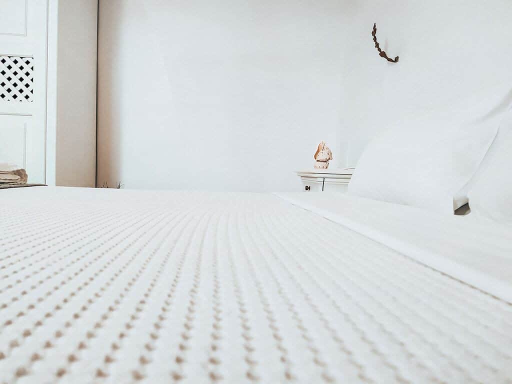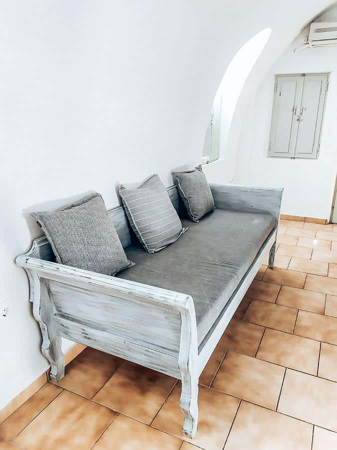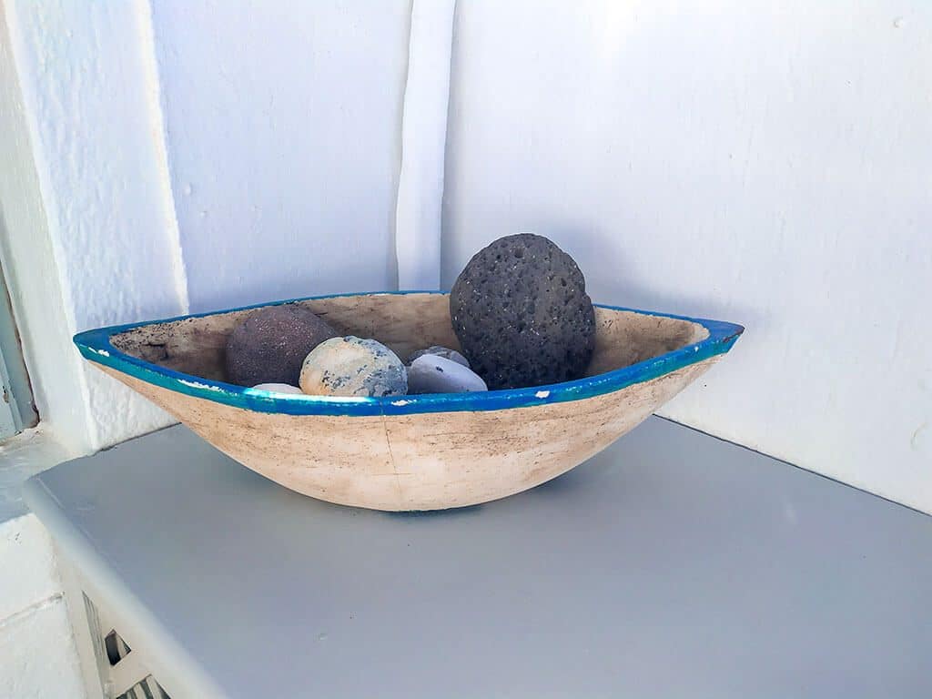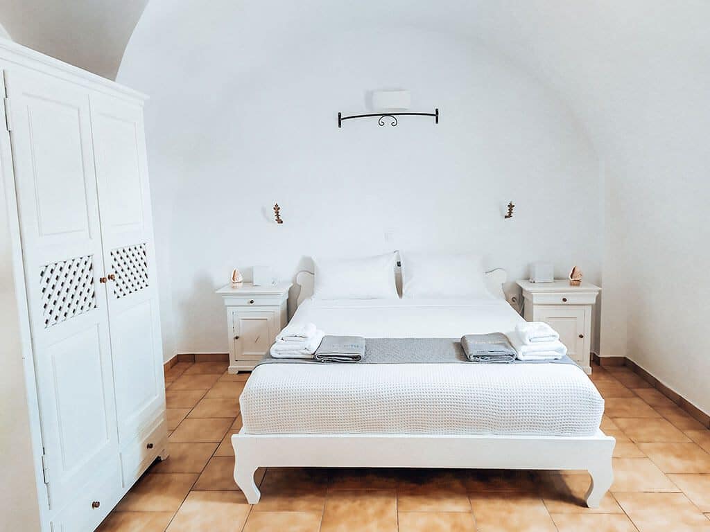 Η διακόσμηση είναι μινιμαλιστική με διακριτές καμάρες και νησιώτικες λεπτομέρειες που θ’ αγαπήσετε. Από τα κοχύλια στα κομοδίνα μέχρι τη ζωγραφιστή σκάφη στην άκρη του δωματίου, αναδεικνύεται ο συνδυασμός μοντέρνου και παραδοσιακόυ στοιχείου προσφέροντας μια ζεστή ατμόσφαιρα!