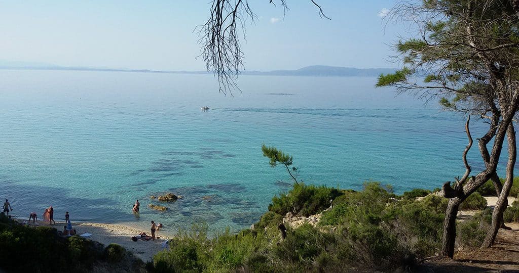 Από εκεί, περπατάς μέσα στα πεύκα μέχρι να αποκαλυφθούν οι Μπαχάμες, Σευχέλλες και Καραιβική μαζί(ναι, κάπως έτσι τις έχω στο μυαλό μου!). Το τοπίο και οι αποχρώσεις του νερού θα σε μαγέψουν. Μάλιστα, σ’ ένα από τα κολπάκια υπάρχει και beach bar. Παρόλ’ αυτά, θα σε συμβούλευα, για να απολαύσεις την πραγματική ομορφιά του μέρους, να πάρεις την ομπρελίτσα και τις πετσέτες σου και να αράξεις σε κάποιο από τα ανοργάνωτα κολπάκια».