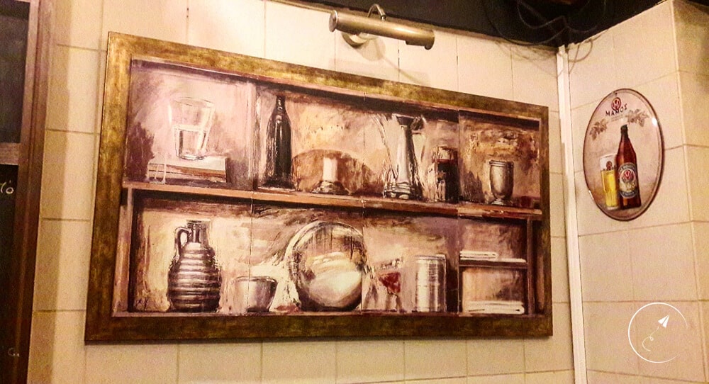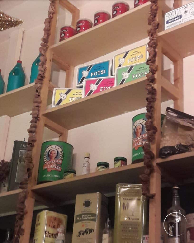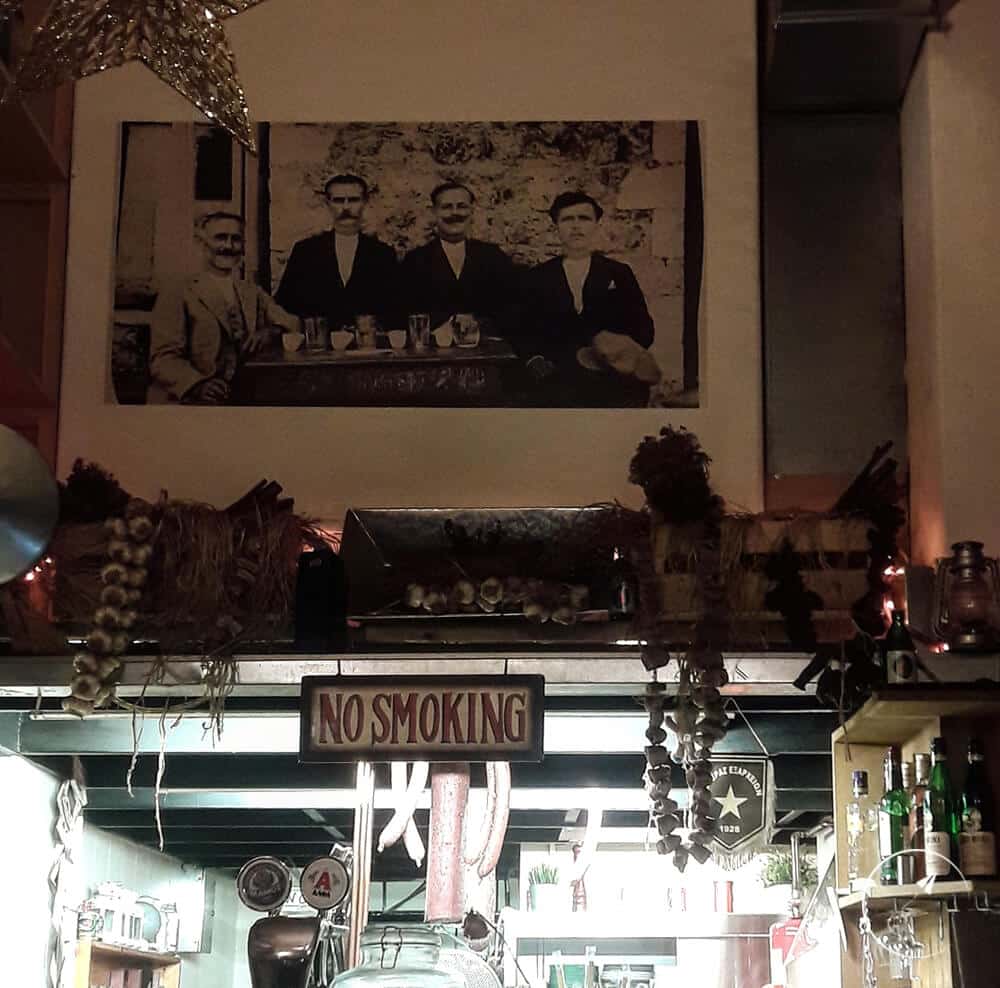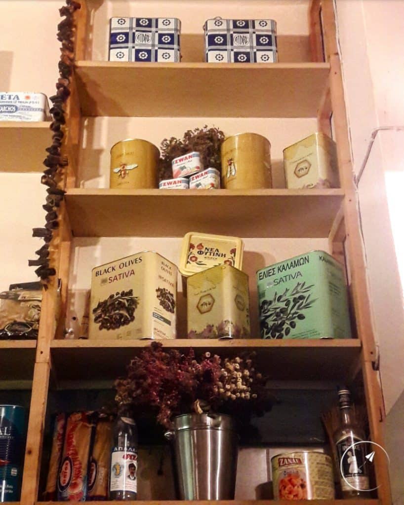 Αυτό που εντυπωσιάζει όμως, είναι η εσωτερική διακόσμηση που έχει κάτι το παραδοσιακό, κάτι από “Μπακαλόγατο” και σίγουρα θα σου θυμίσει τις “παλιές καλές εποχές”. Ράφια με τενεκέδες από φέτα, λάδι, ντοματοπολτό, απορρυπαντικά και ό,τι άλλο σε συνδυασμό “traditional – retro” μπορείς να φανταστείς. Προσωπικά, μου άρεσε και η πινελιά με τον πίνακα με τους παππούδες πάνω από την κουζίνα. Παραπέμπει σε χωριό και με ταξιδεύει!