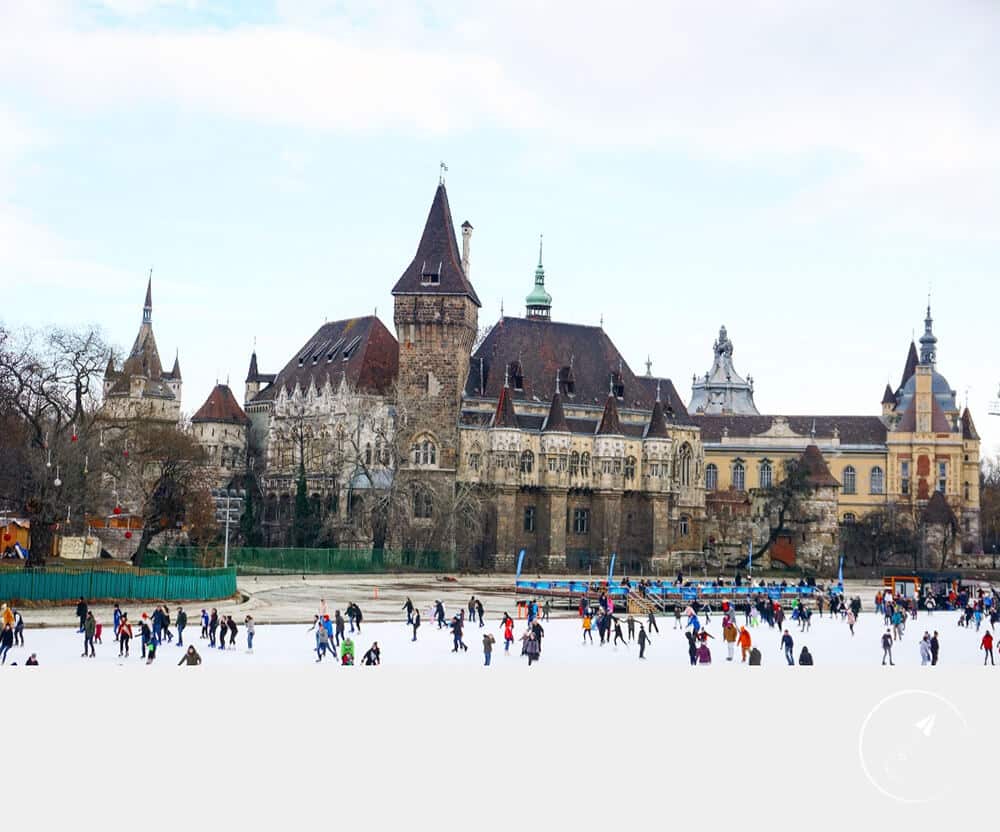 The most romantic part of Budapest is located next to Lake Varosliget. A castle with various architectural styles. If you visit it in winter, (like me) in the location of the lake, you will find an ice rink. Near the castle, you will discover many kiosks that sell traditional food and souvenirs